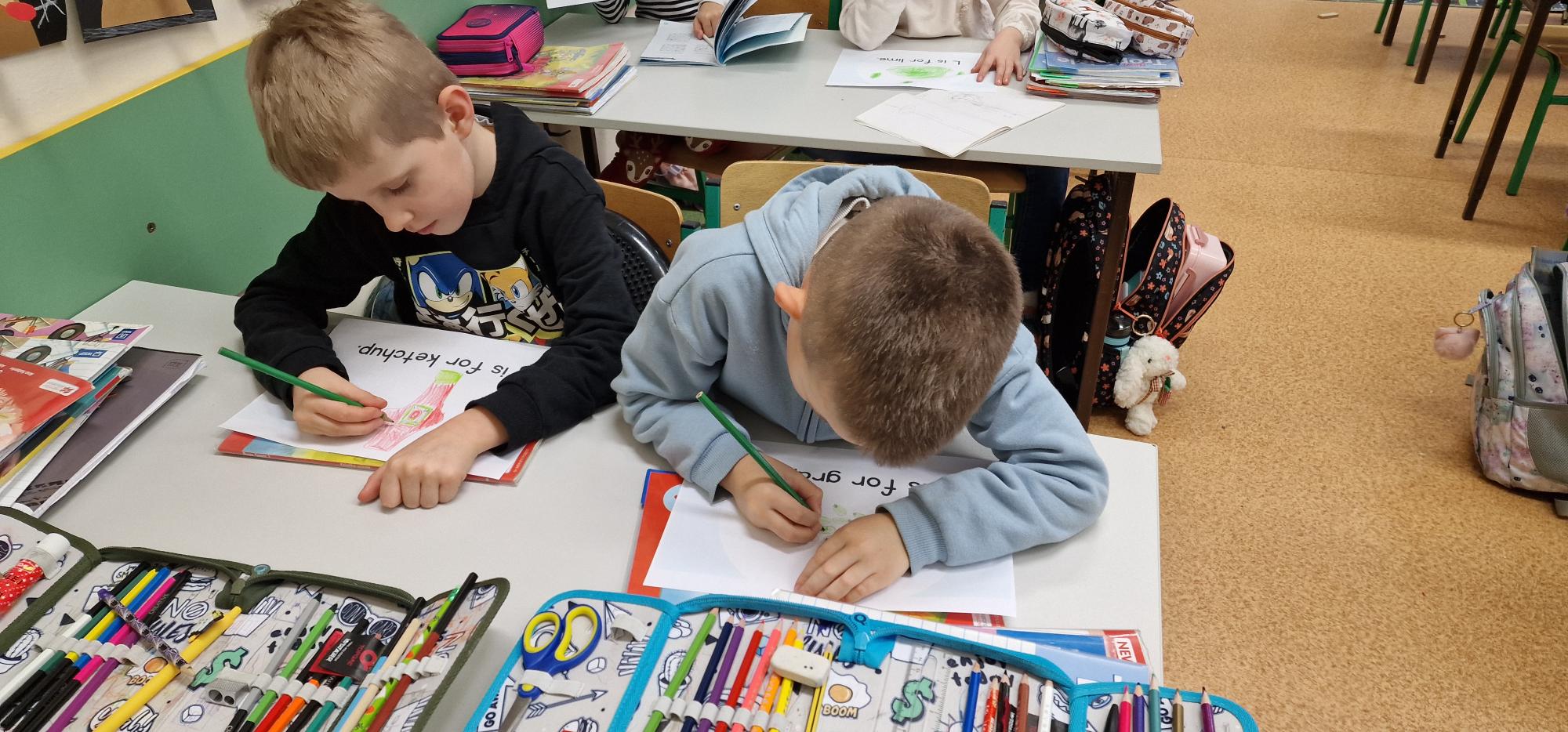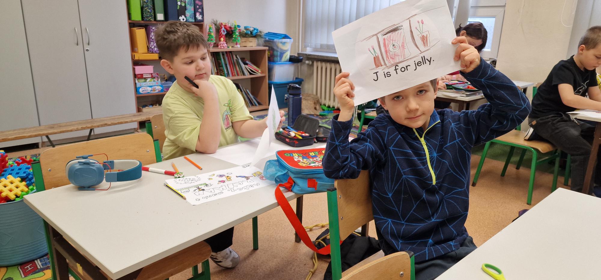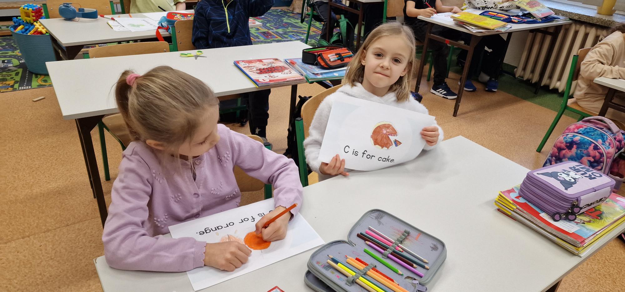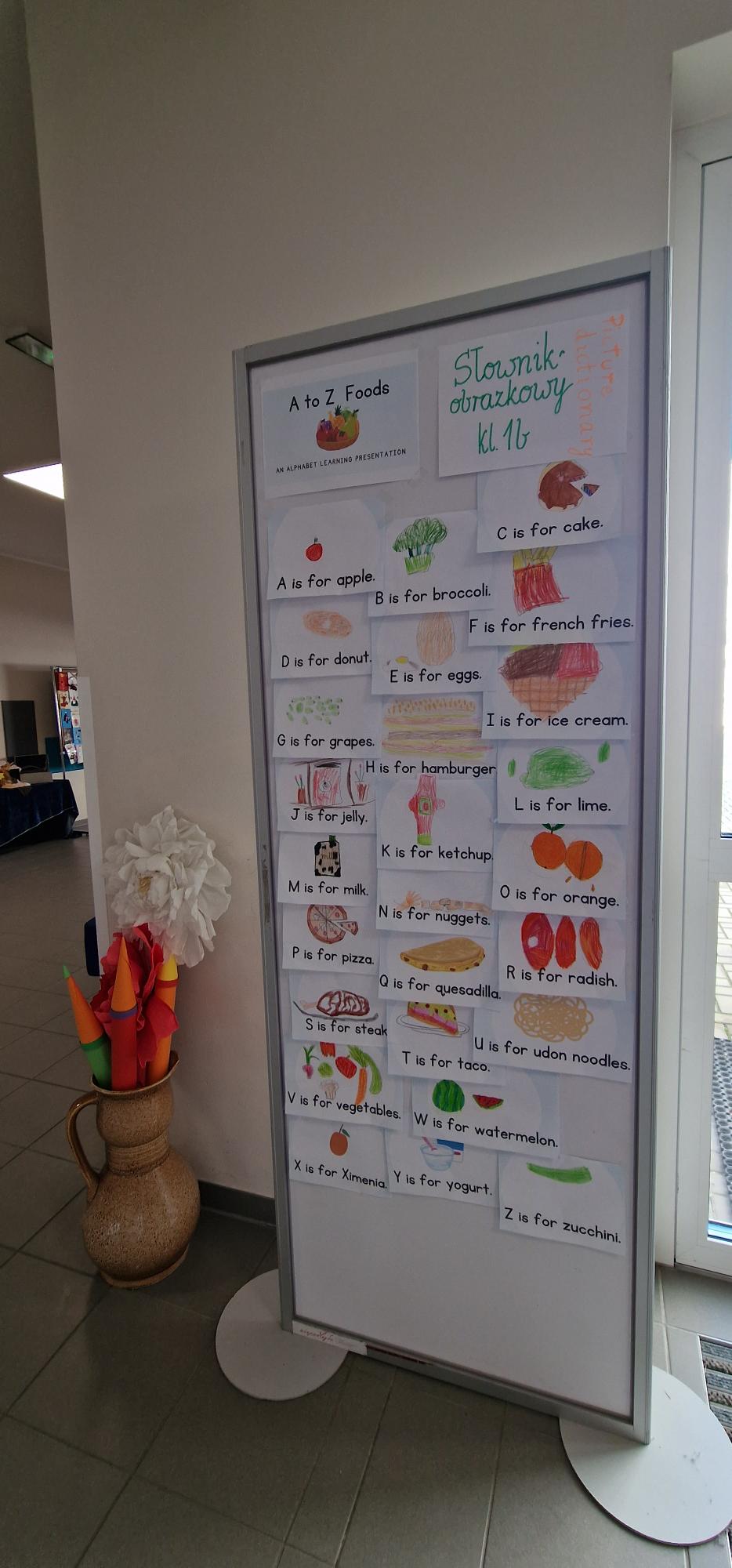 W ramach szkolnego hasła roku „Hello, Hallo, Hola – żaden język nie jest nam obcy” pierwszoklasiści przygotowali wyjątkowe słowniczki obrazkowe. Podczas lekcji języka angielskiego wspólnie poznawali alfabet, śpiewali radosne piosenki oraz tworzyli piękne, kolorowe rysunki, które można podziwiać w holu szkoły.