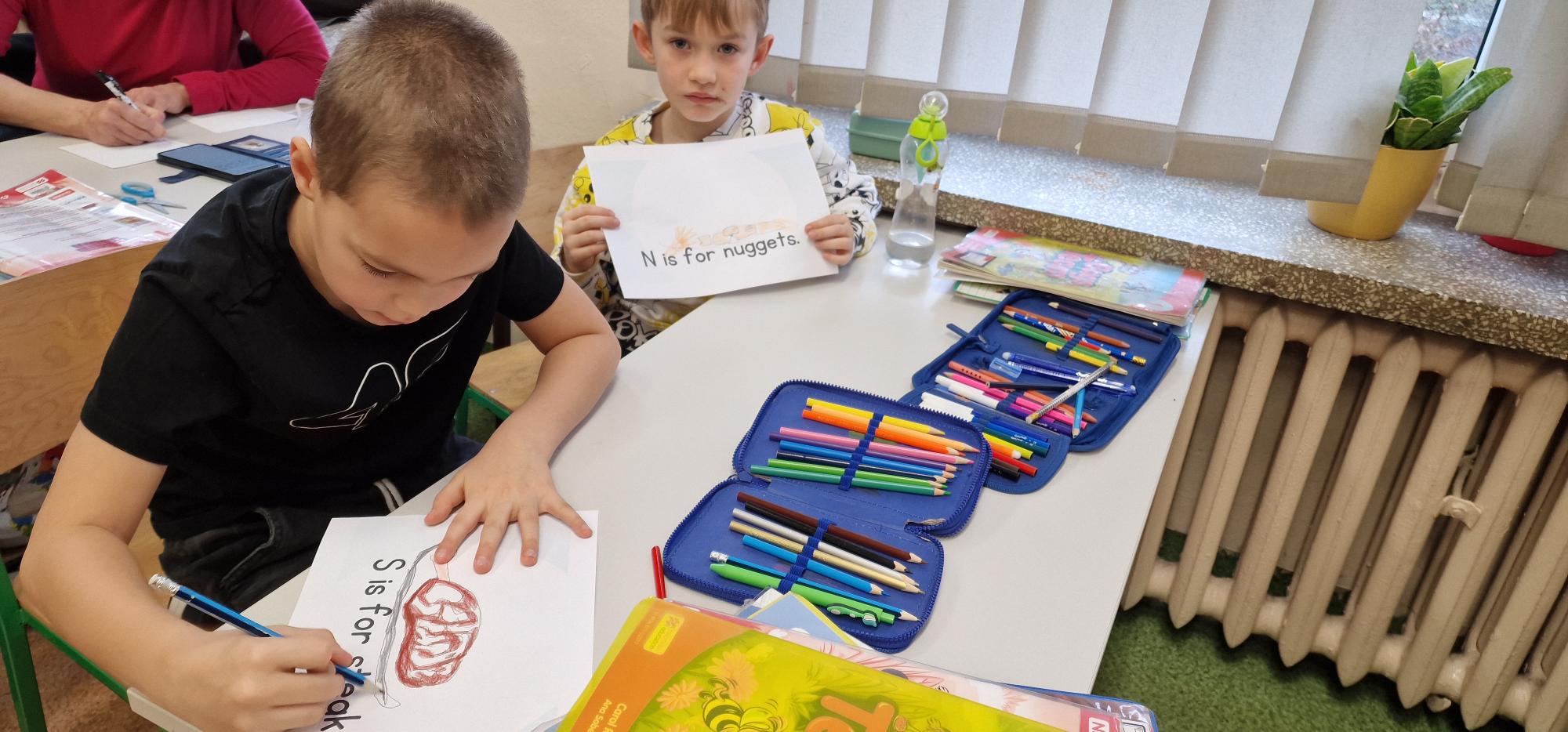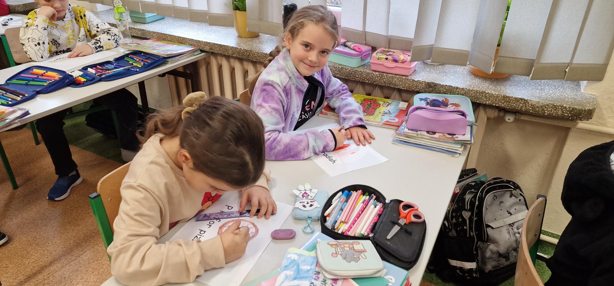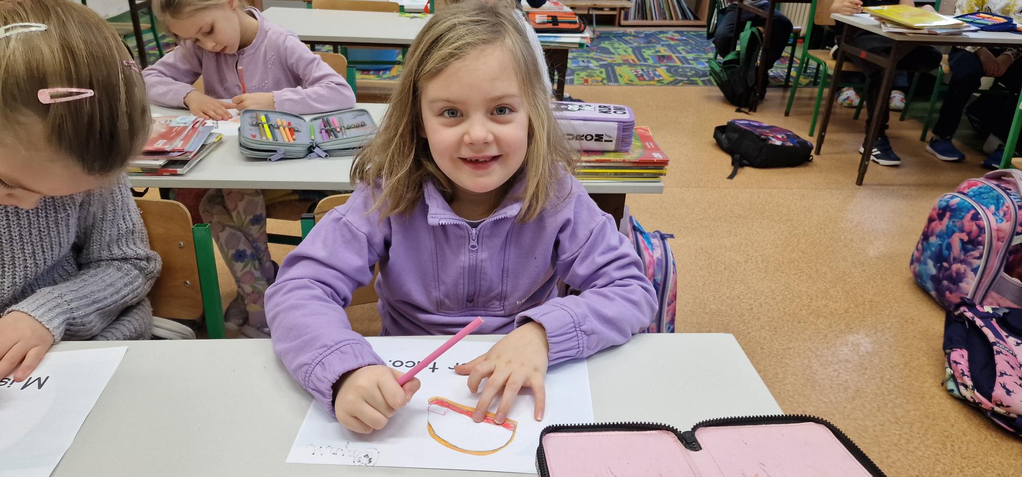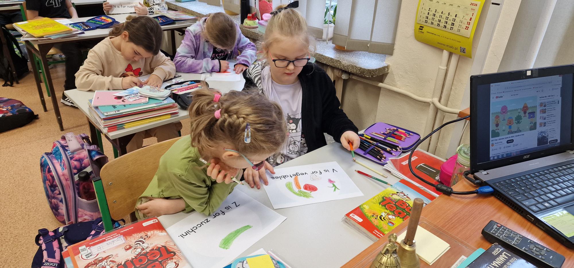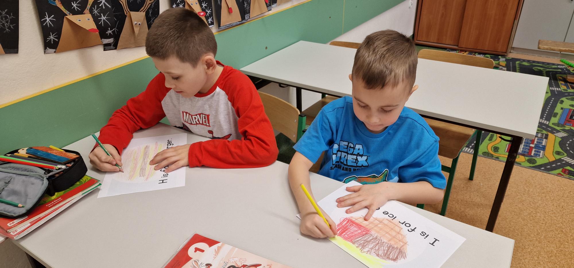 W ramach szkolnego hasła roku „Hello, Hallo, Hola – żaden język nie jest nam obcy” pierwszoklasiści przygotowali wyjątkowe słowniczki obrazkowe. Podczas lekcji języka angielskiego wspólnie poznawali alfabet, śpiewali radosne piosenki oraz tworzyli piękne, kolorowe rysunki, które można podziwiać w holu szkoły.