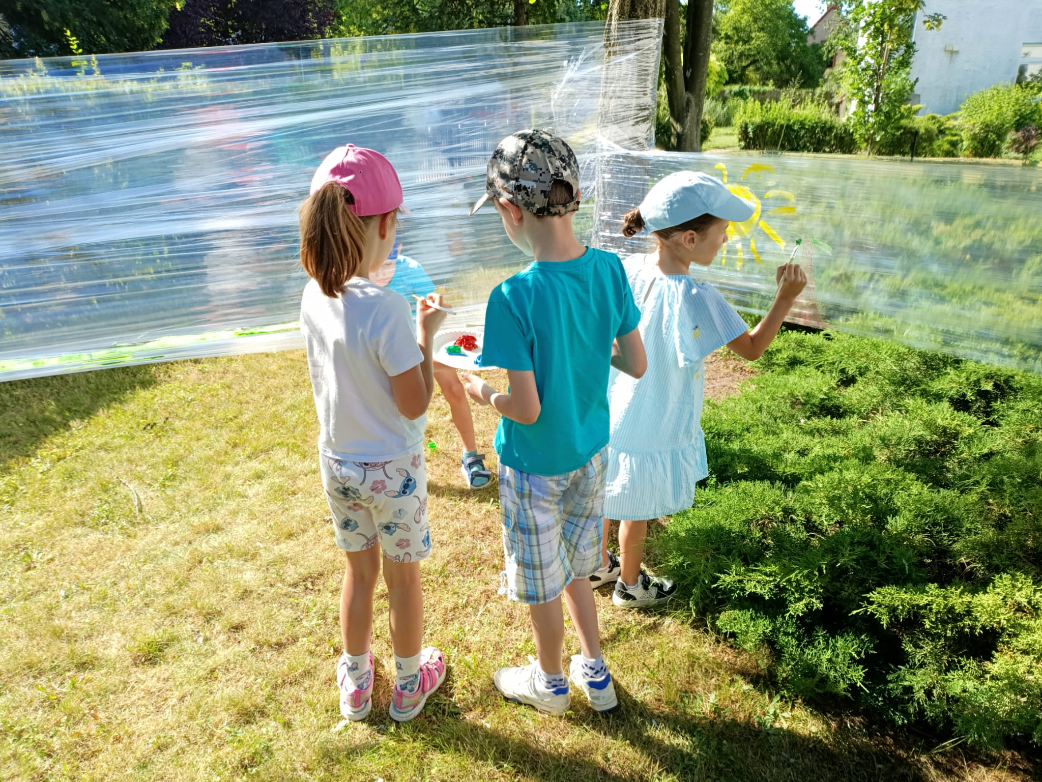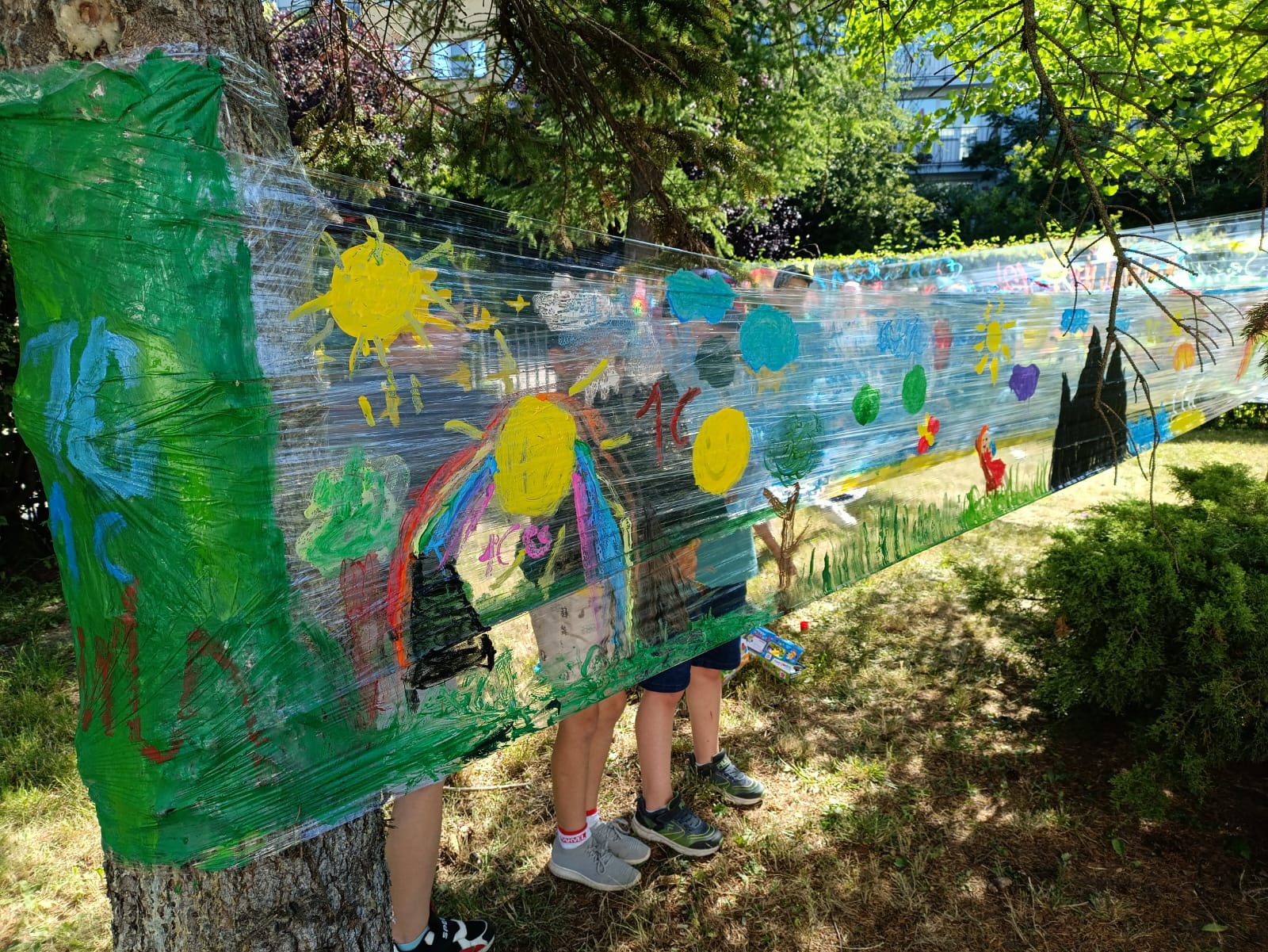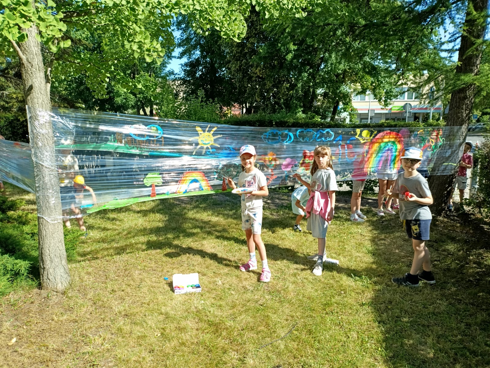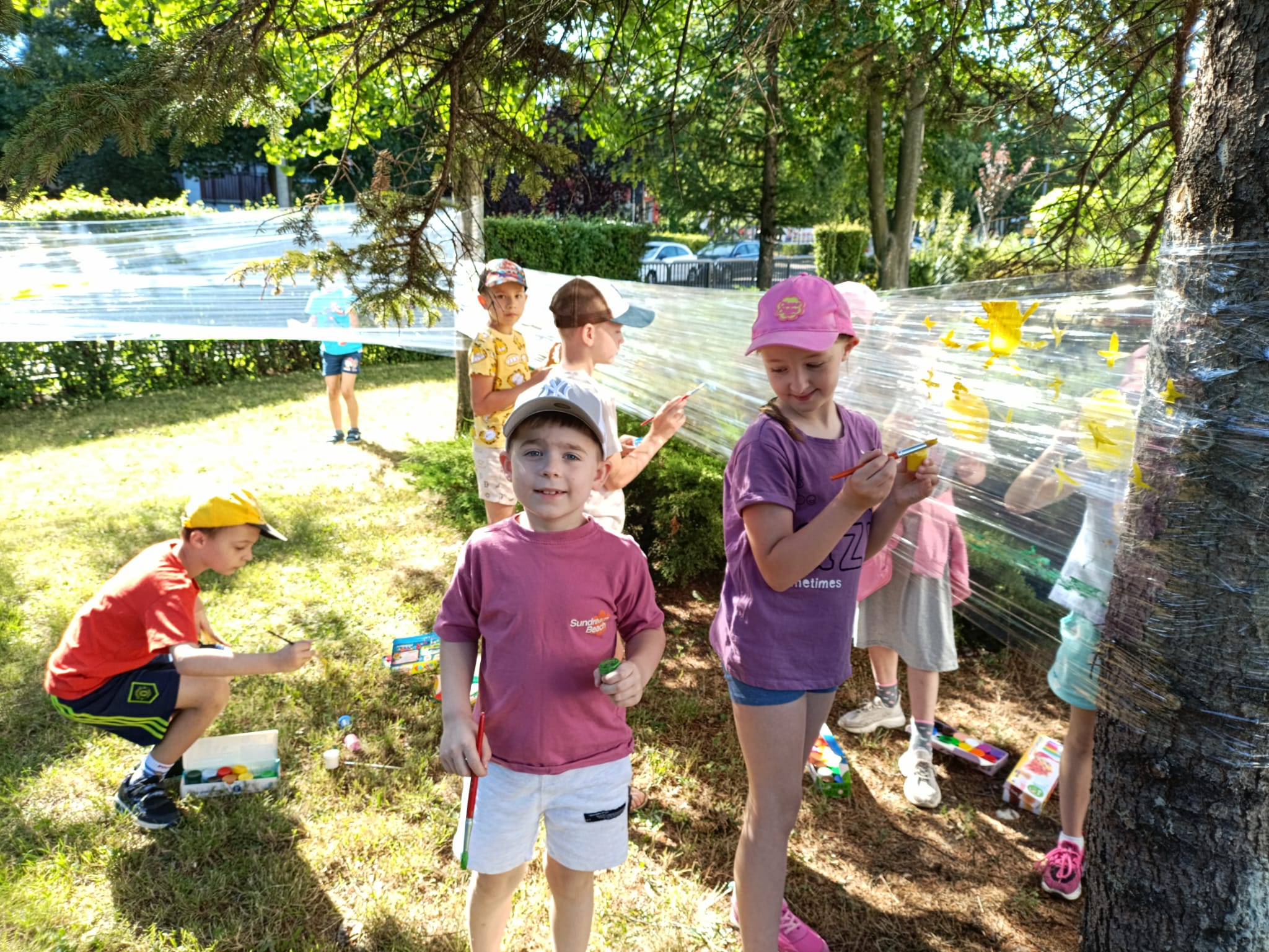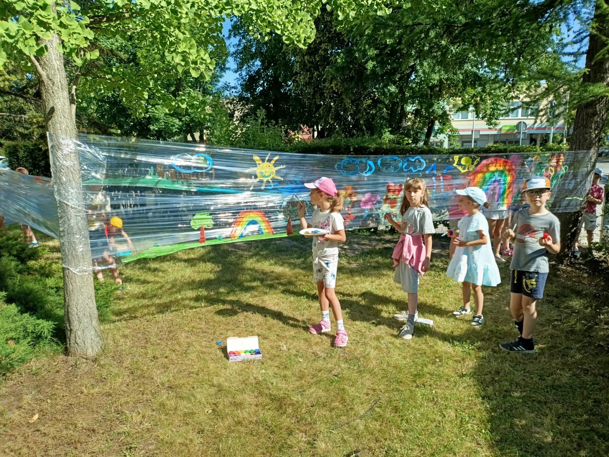Do stworzenia prac wykorzystano przezroczystą folię rozwieszoną między drzewami – to właśnie na niej dzieci malowały swoje wakacyjne wizje. Kolorowe rysunki dodały szkolnemu otoczeniu jeszcze więcej letniego klimatu i pozytywnej energii.