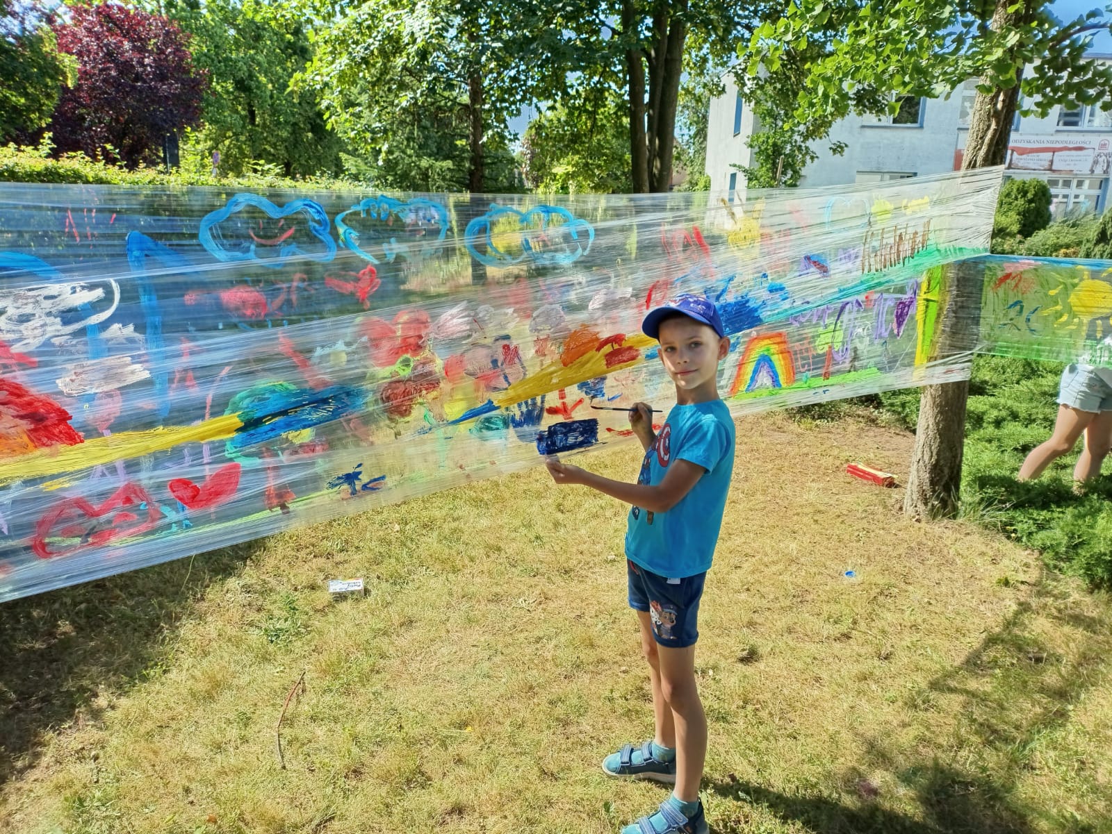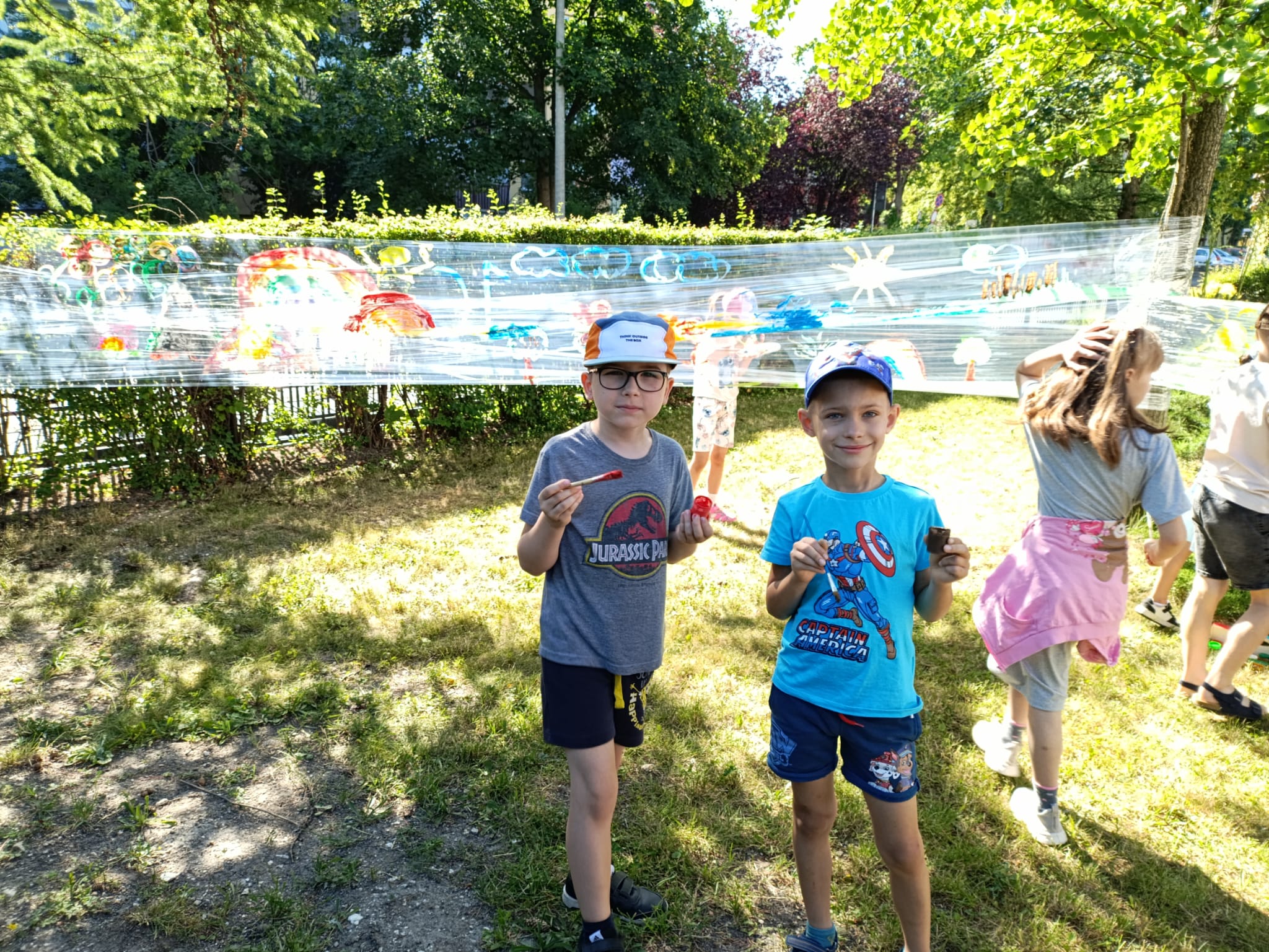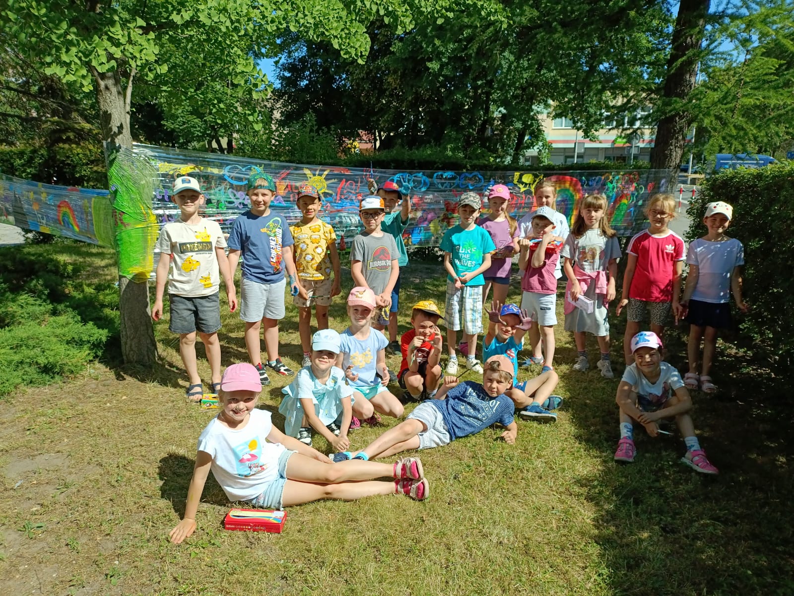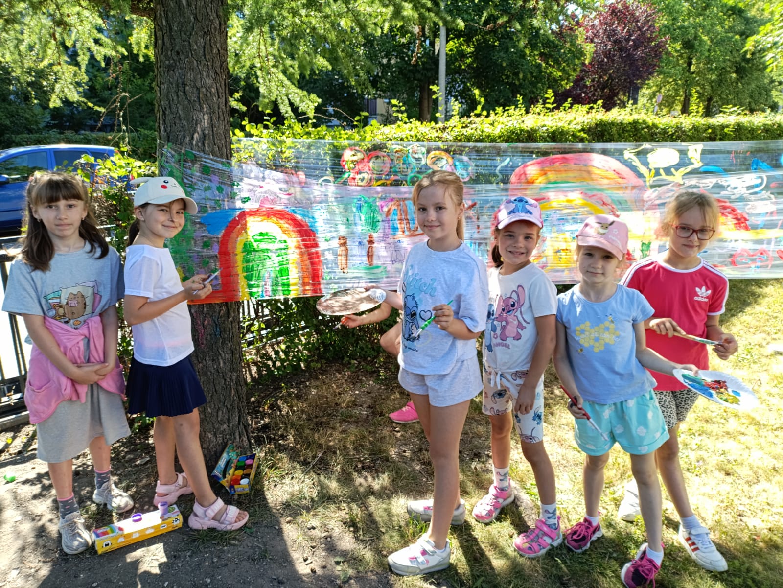 Do stworzenia prac wykorzystano przezroczystą folię rozwieszoną między drzewami – to właśnie na niej dzieci malowały swoje wakacyjne wizje. Kolorowe rysunki dodały szkolnemu otoczeniu jeszcze więcej letniego klimatu i pozytywnej energii.