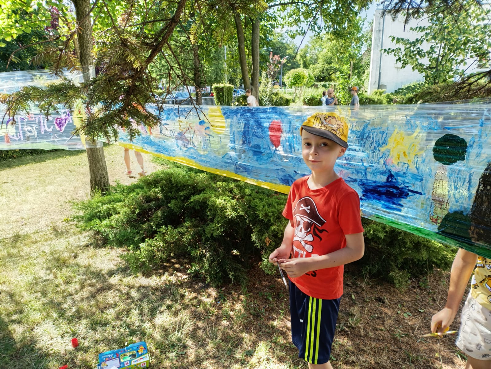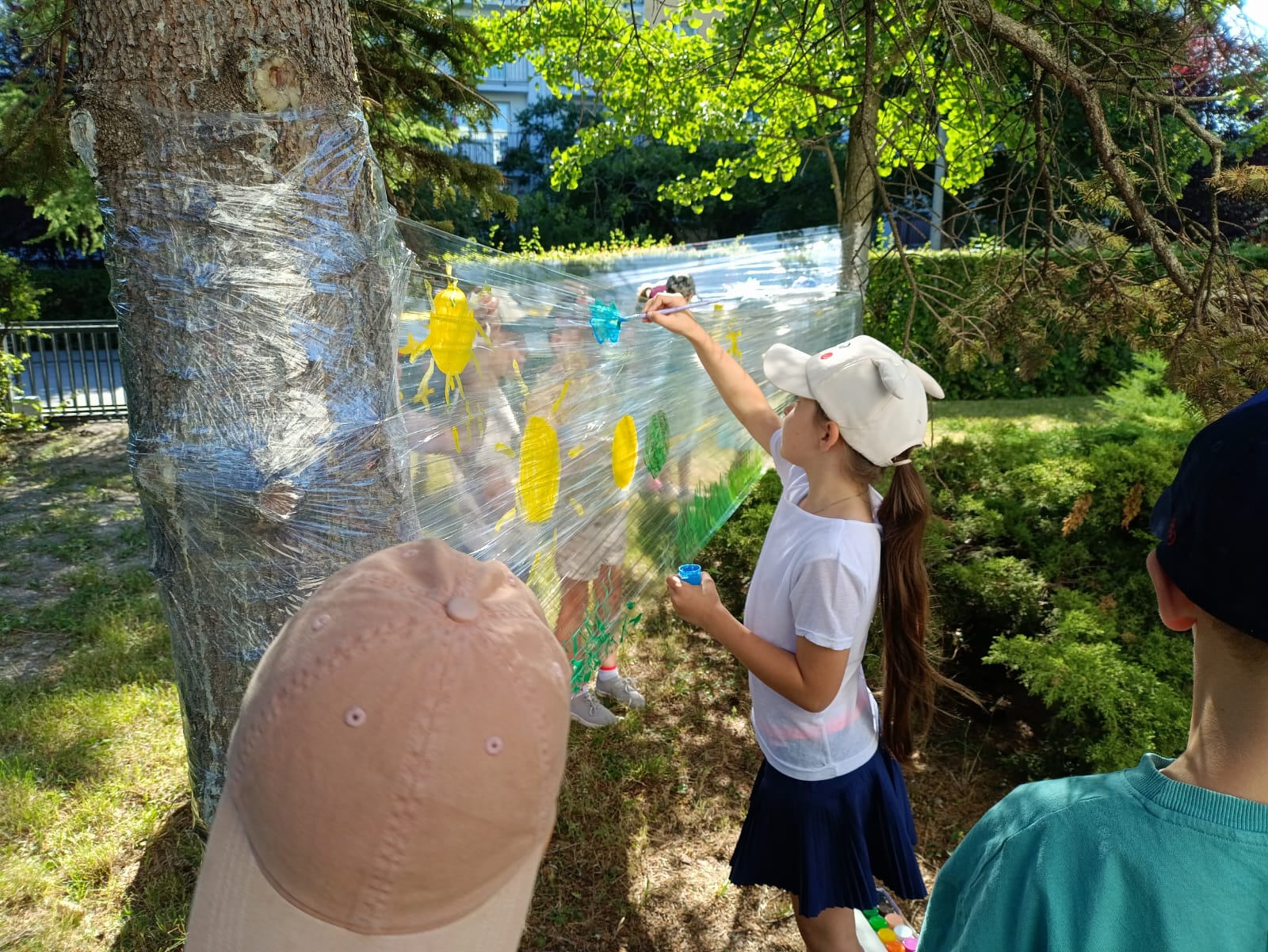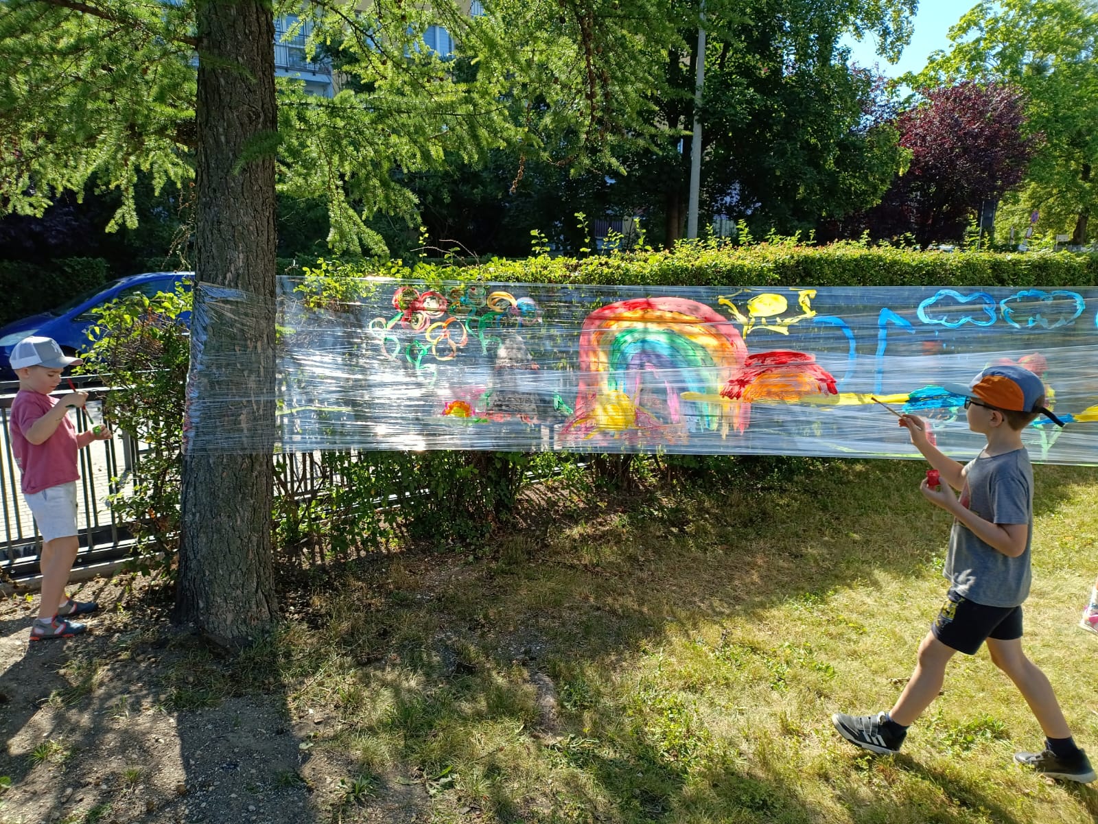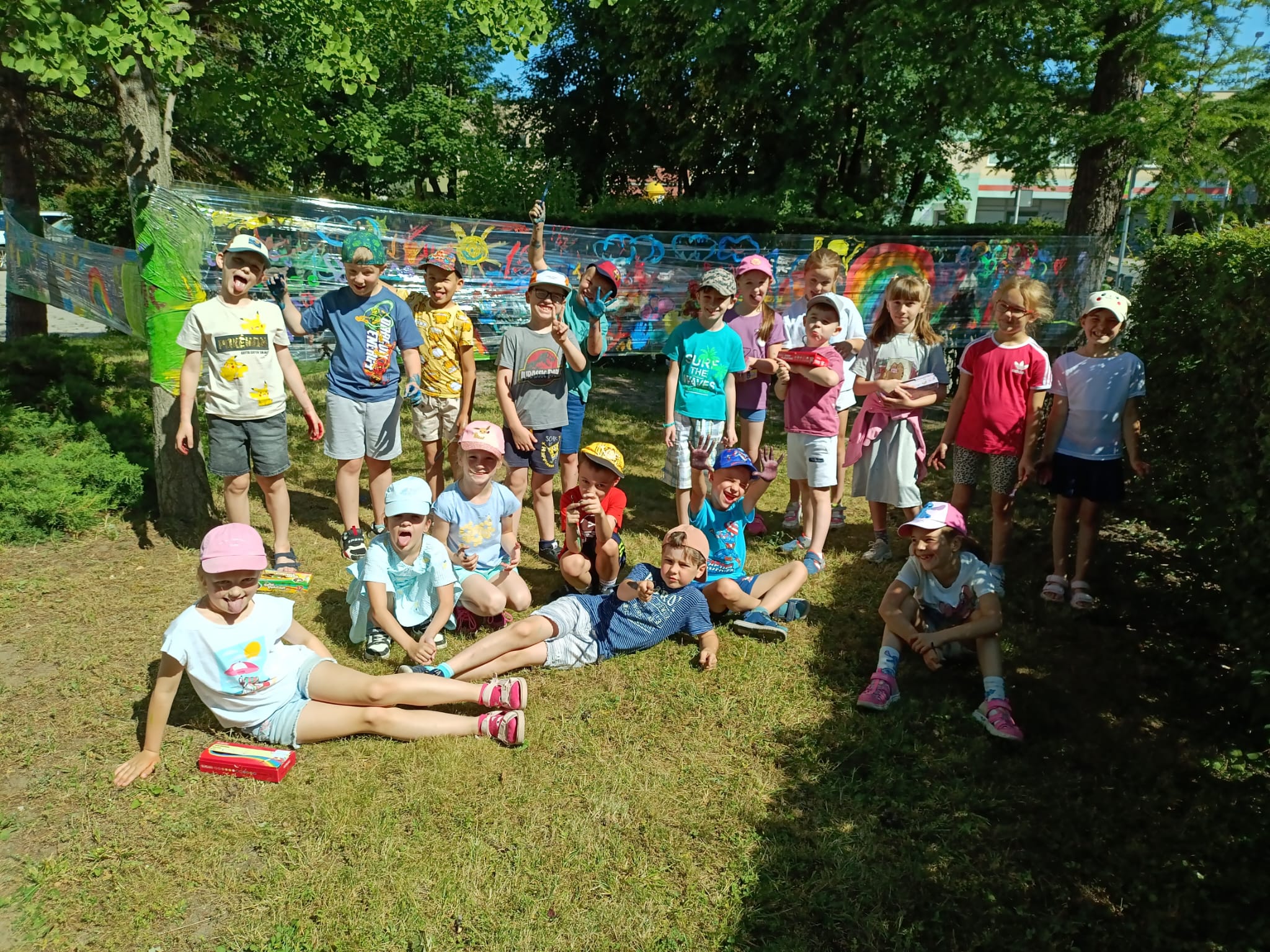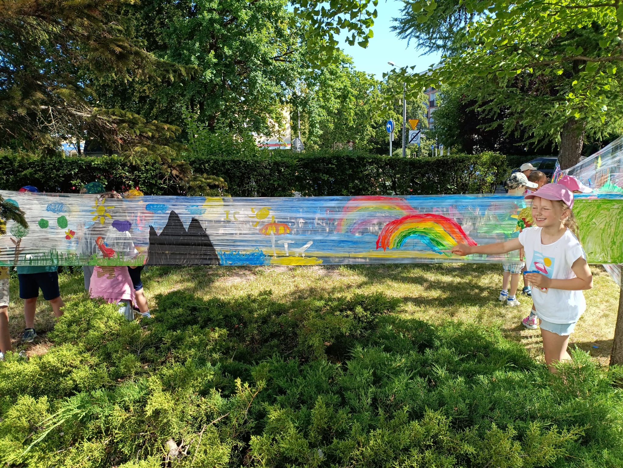 Do stworzenia prac wykorzystano przezroczystą folię rozwieszoną między drzewami – to właśnie na niej dzieci malowały swoje wakacyjne wizje. Kolorowe rysunki dodały szkolnemu otoczeniu jeszcze więcej letniego klimatu i pozytywnej energii.