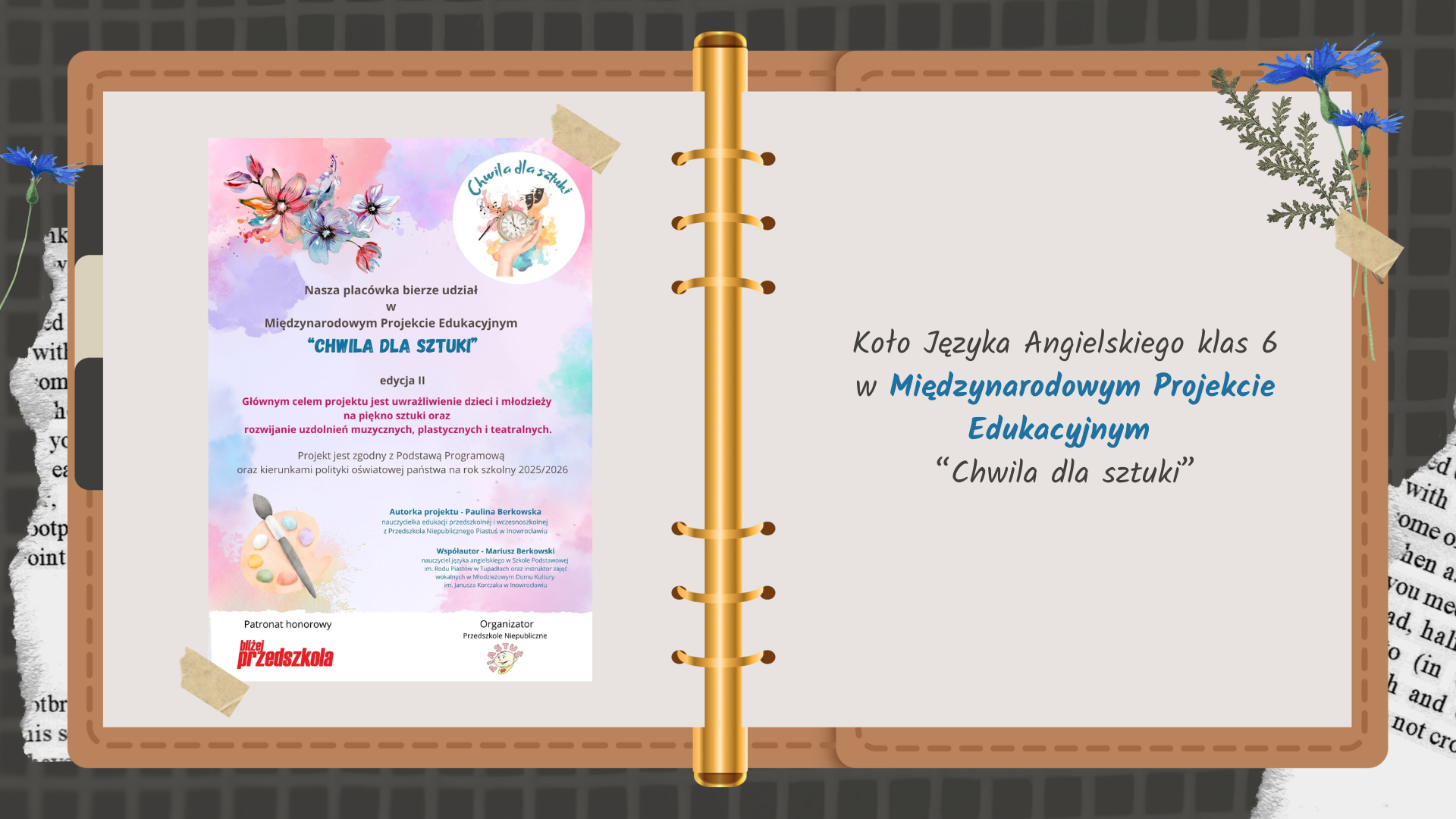 W bieżącym roku szkolnym nasza szkoła przystąpiła do Międzynarodowego Projektu Edukacyjnego „Chwila dla sztuki”. W inicjatywie bierze udział ponad 400 placówek nie tylko z Polski, lecz także m.in. ze Stanów Zjednoczonych, Wielkiej Brytanii, Danii czy Litwy!