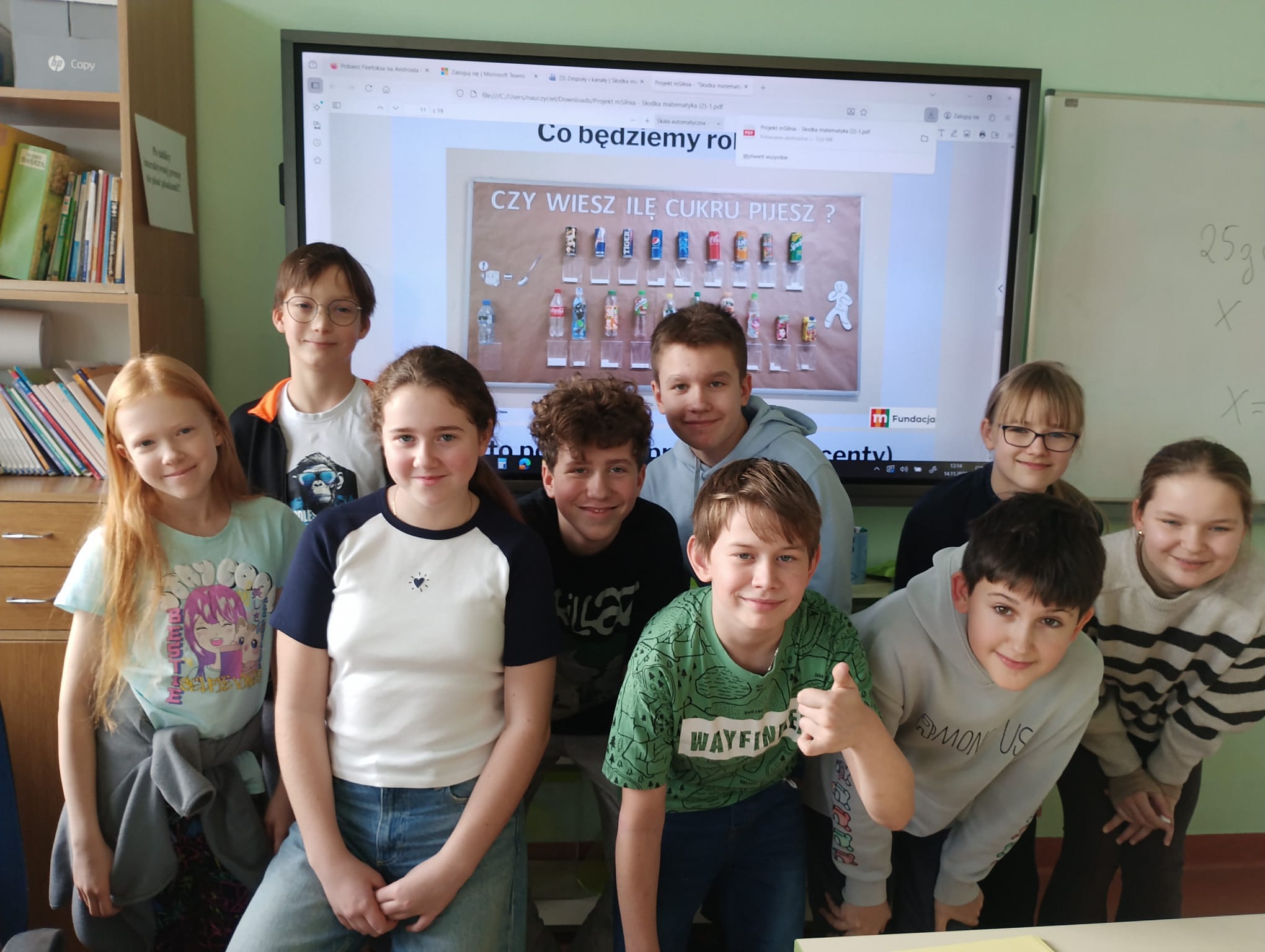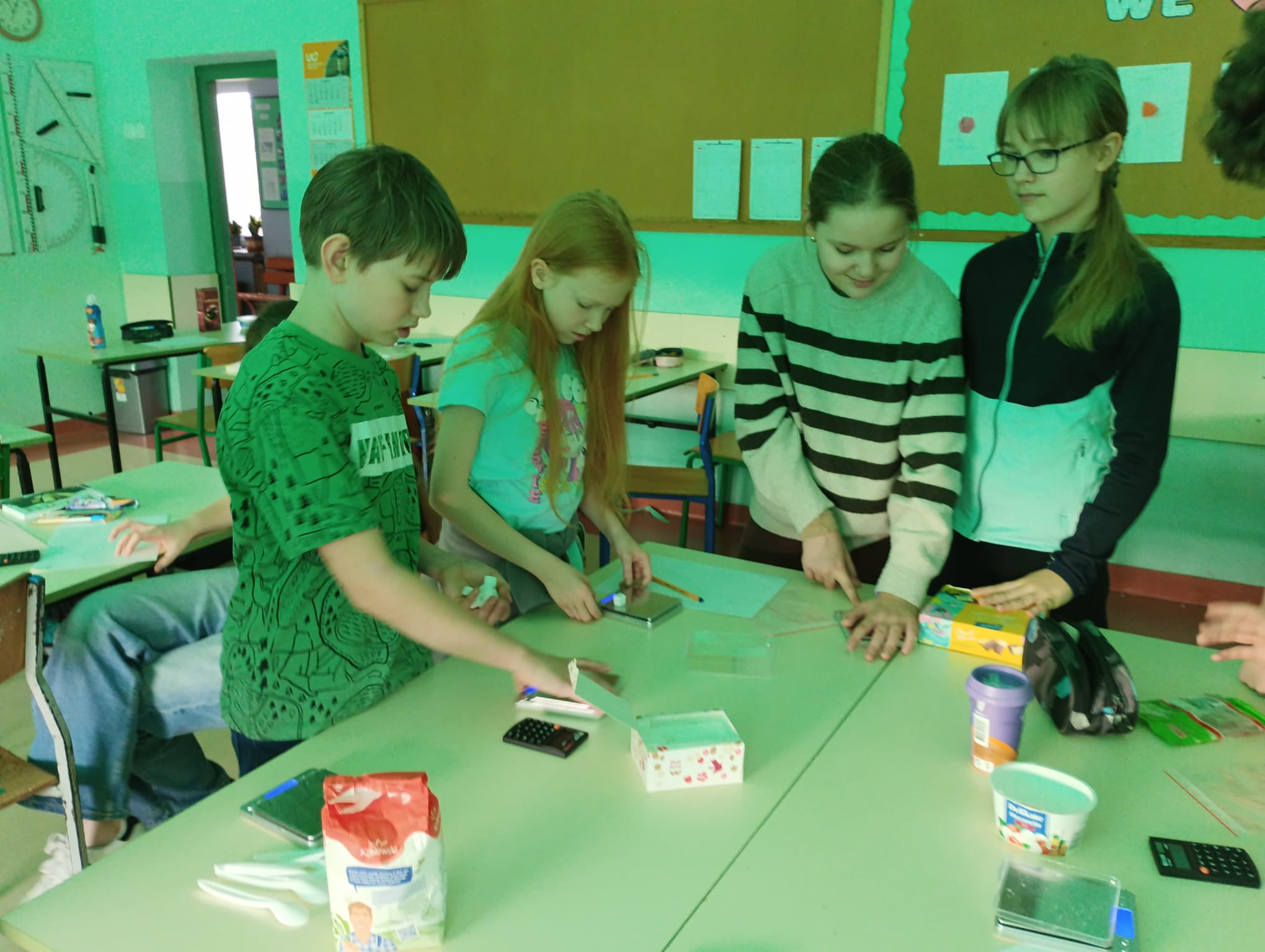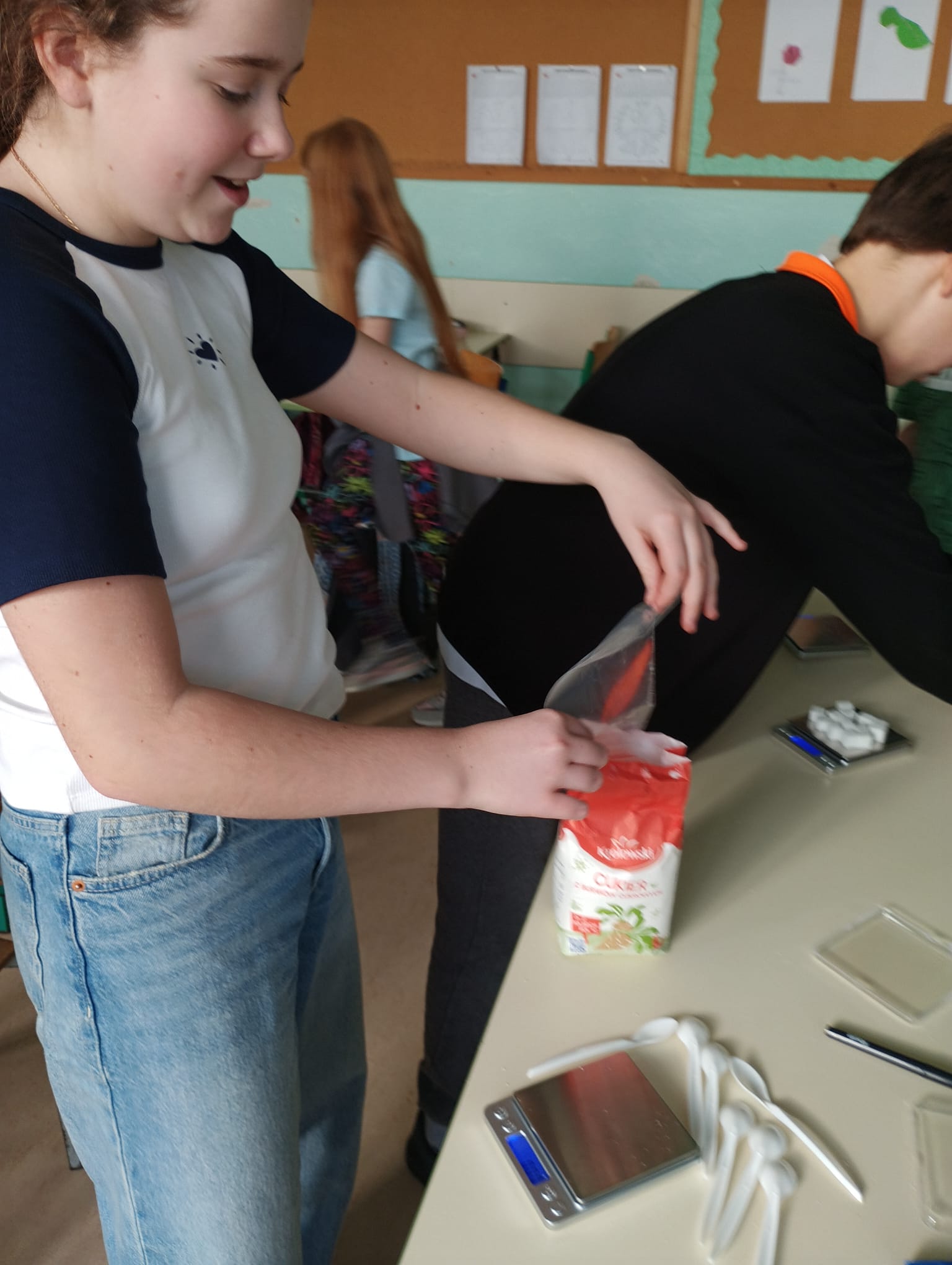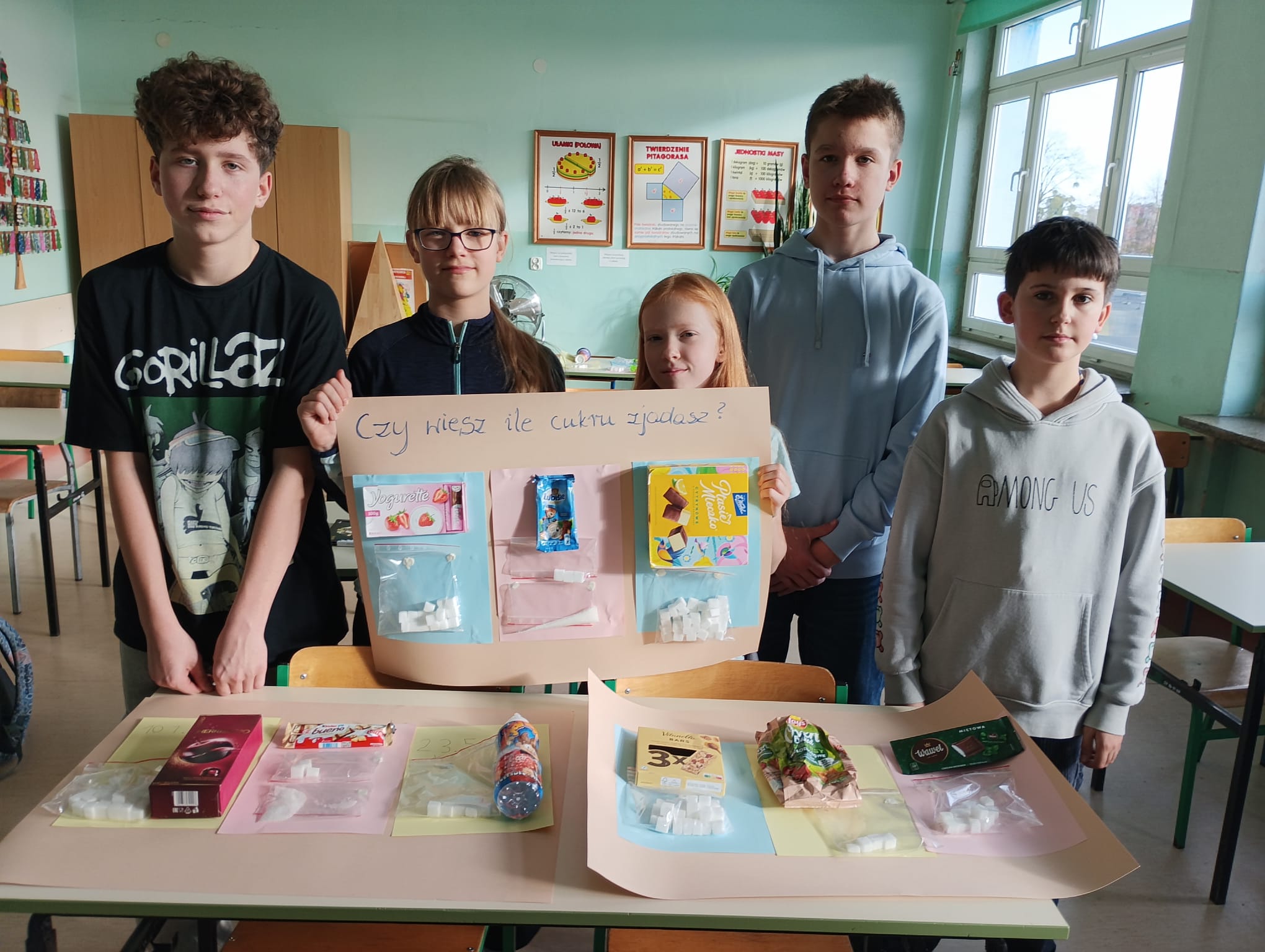 W ramach projektu „Słodka matematyka” odbyły się kolejne angażujące zajęcia dla uczniów klas szóstych. Tym razem uczestnicy odmierzali rzeczywiste ilości cukru znajdujące się w popularnych produktach spożywczych. Korzystali przy tym z pomocy zakupionych w projekcie tj. wag, kalkulatorów, przyborów papierniczych oraz oczywiście… cukru! Uczniowie z dużym zaangażowaniem analizowali etykiety produktów, przeliczali ilość cukru na kostki, a następnie tworzyli plakaty edukacyjne, które w obrazowy sposób pokazywały, ile słodkich „kostek” kryje się w napojach, jogurtach czy batonach. Było przy tym mnóstwo zabawy, ale też wiele zaskoczenia, bo uczniowie sami odkrywali, jak bardzo różni się deklarowana „słodycz” produktu od jej faktycznej zawartości. Zajęcia pozwoliły połączyć matematykę z codziennymi wyborami żywieniowymi, rozwijając jednocześnie umiejętności obliczeniowe, analityczne i kreatywne.