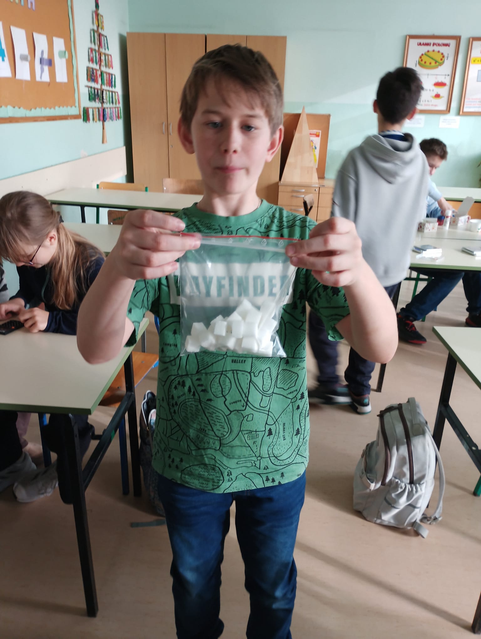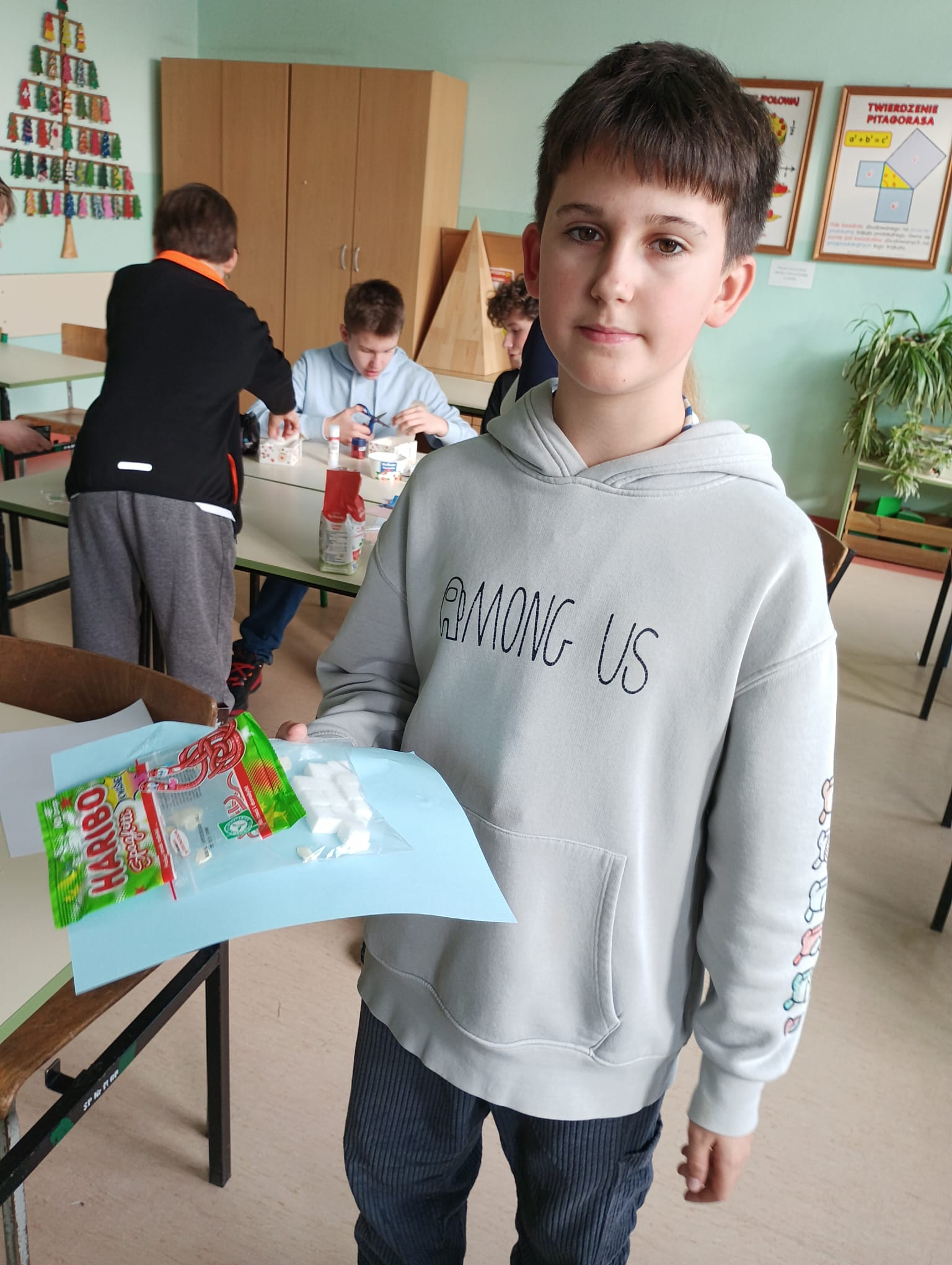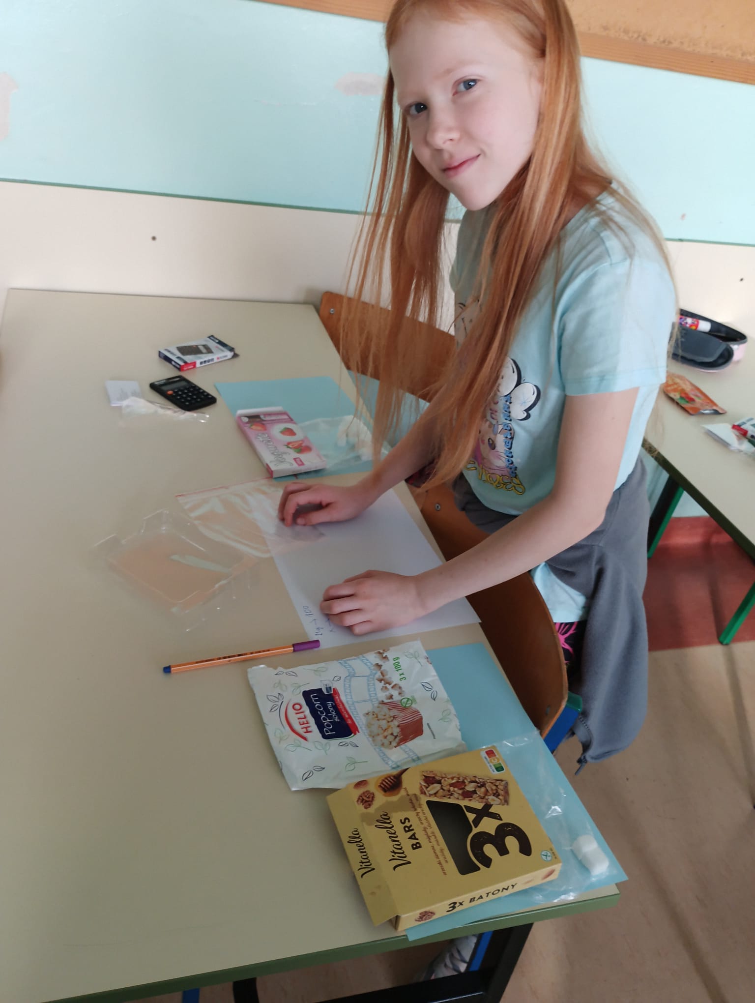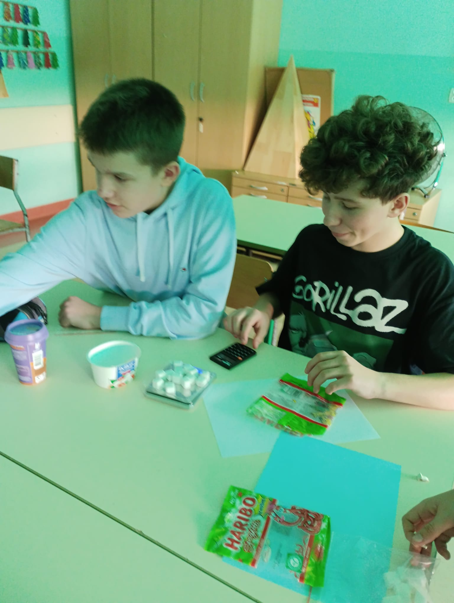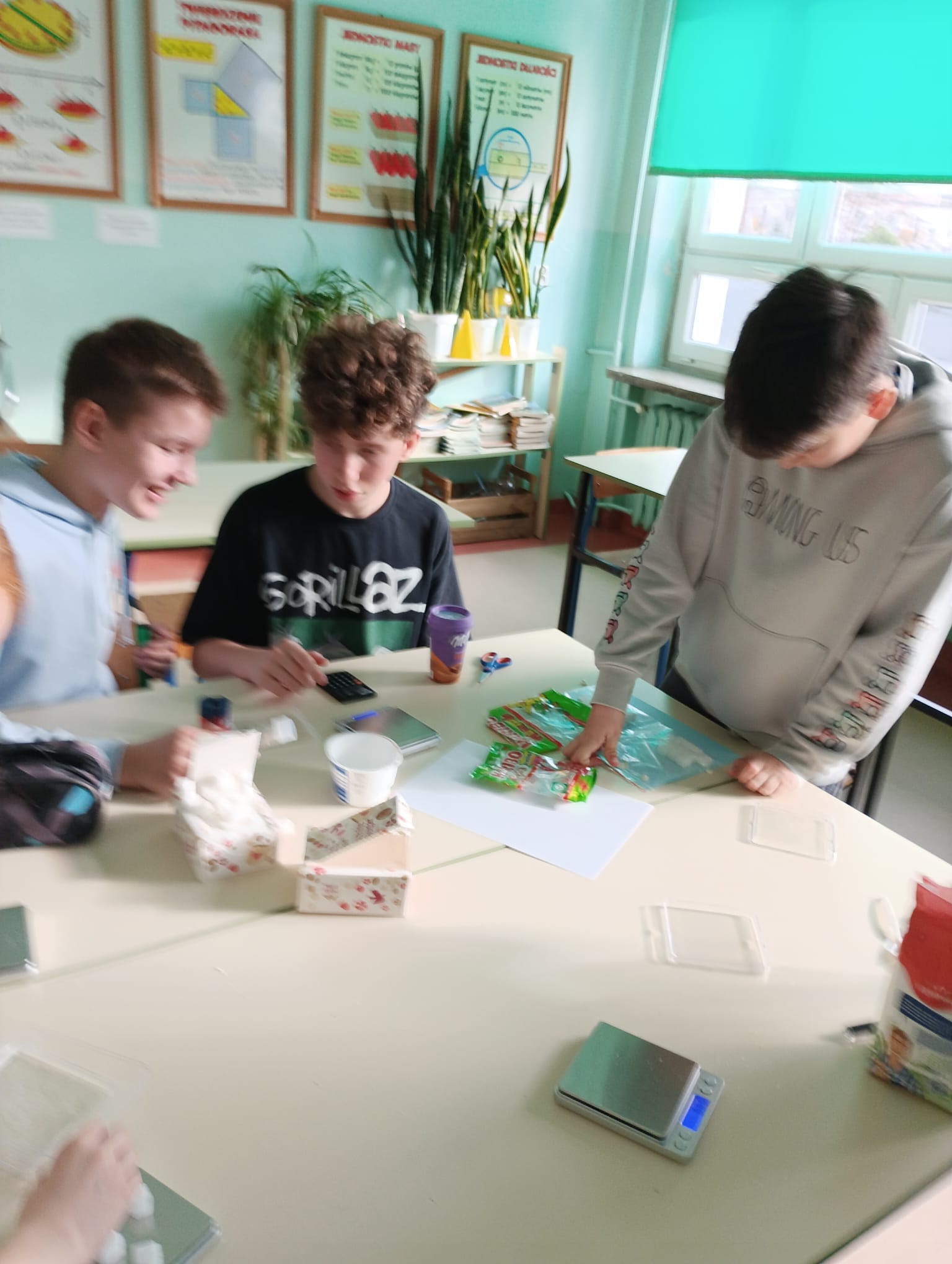 W ramach projektu „Słodka matematyka” odbyły się kolejne angażujące zajęcia dla uczniów klas szóstych. Tym razem uczestnicy odmierzali rzeczywiste ilości cukru znajdujące się w popularnych produktach spożywczych. Korzystali przy tym z pomocy zakupionych w projekcie tj. wag, kalkulatorów, przyborów papierniczych oraz oczywiście… cukru! Uczniowie z dużym zaangażowaniem analizowali etykiety produktów, przeliczali ilość cukru na kostki, a następnie tworzyli plakaty edukacyjne, które w obrazowy sposób pokazywały, ile słodkich „kostek” kryje się w napojach, jogurtach czy batonach. Było przy tym mnóstwo zabawy, ale też wiele zaskoczenia, bo uczniowie sami odkrywali, jak bardzo różni się deklarowana „słodycz” produktu od jej faktycznej zawartości. Zajęcia pozwoliły połączyć matematykę z codziennymi wyborami żywieniowymi, rozwijając jednocześnie umiejętności obliczeniowe, analityczne i kreatywne.