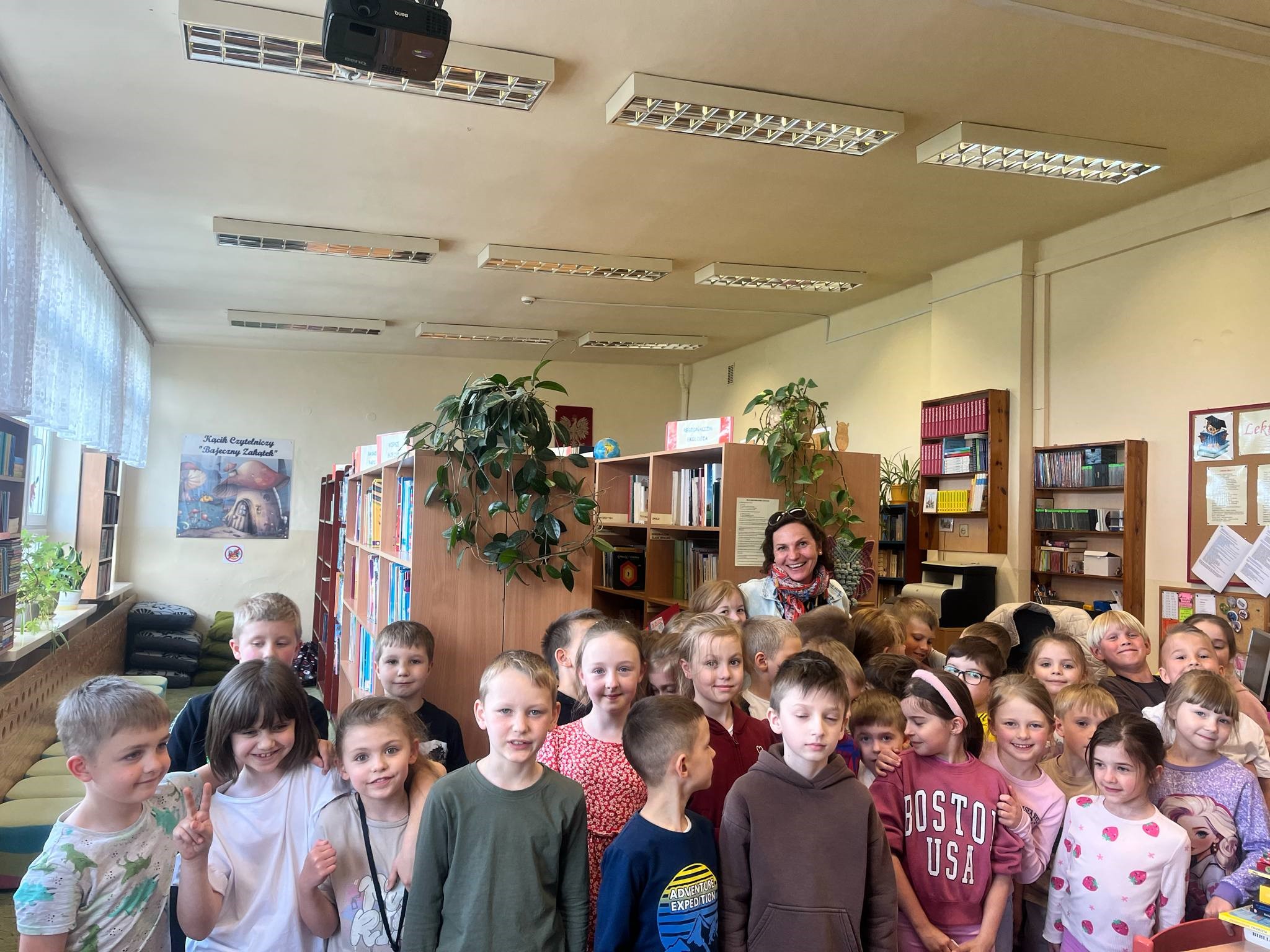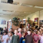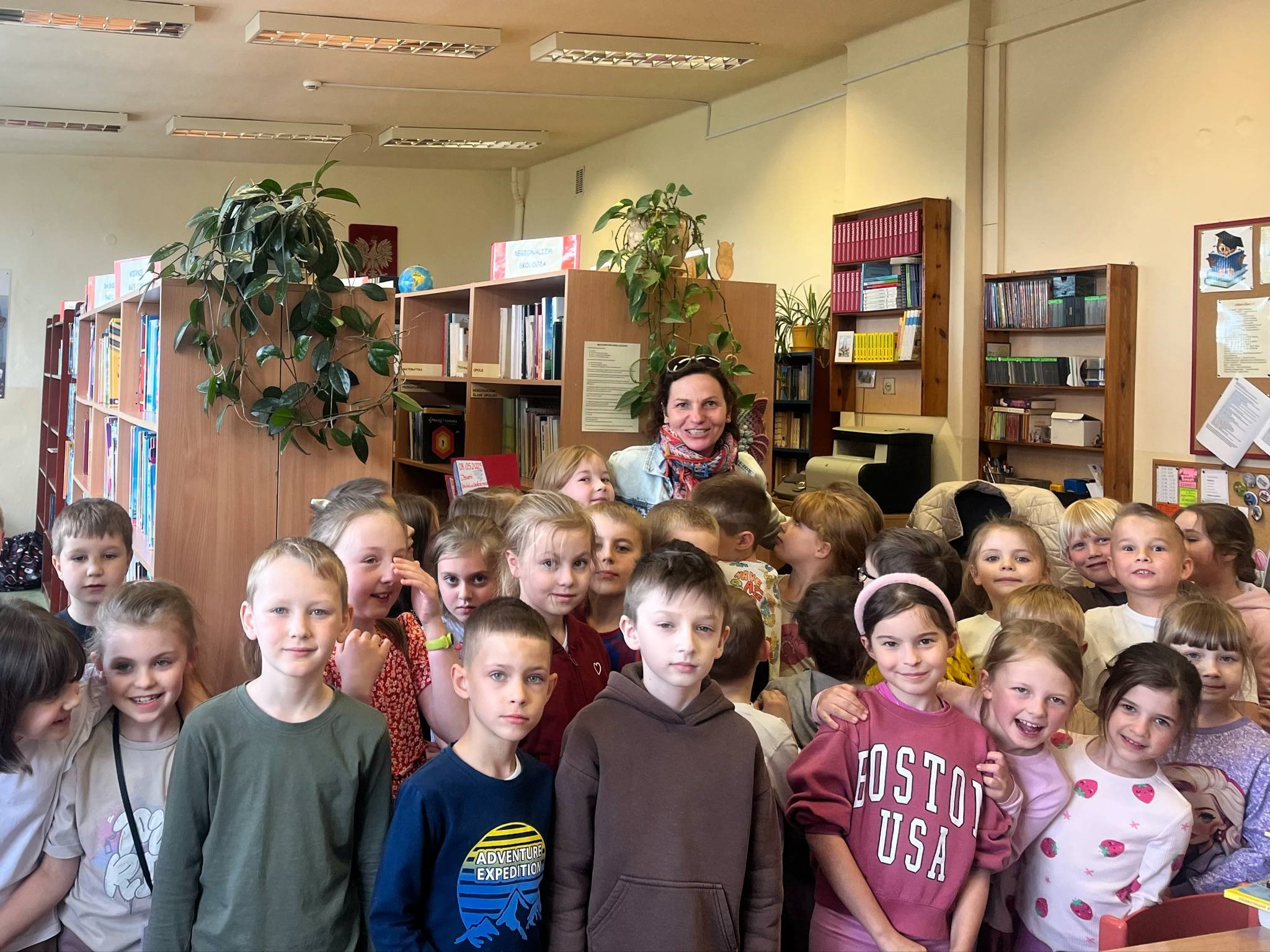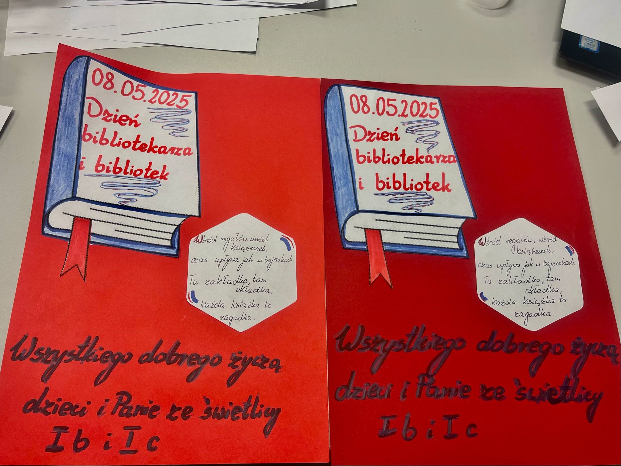 Dnia 8 maja 2025 roku obchodziliśmy Dzień Bibliotek i Bibliotekarza – wyjątkowe święto, które przypomina, jak ważną rolę odgrywają książki i osoby, które pomagają nam je odkrywać. Z tej okazji uczniowie klas 1b i 1c, przebywający w świetlicy szkolnej, odwiedzili naszą bibliotekę, aby złożyć serdeczne życzenia i podziękowania naszym Paniom Bibliotekarkom. Dzieci wręczyły przygotowane kartki z życzeniami oraz ciepłymi słowami uznania.