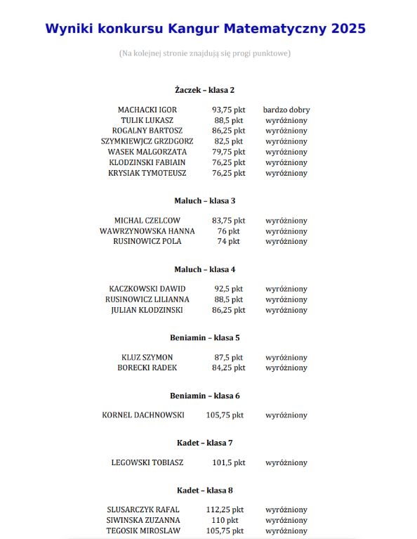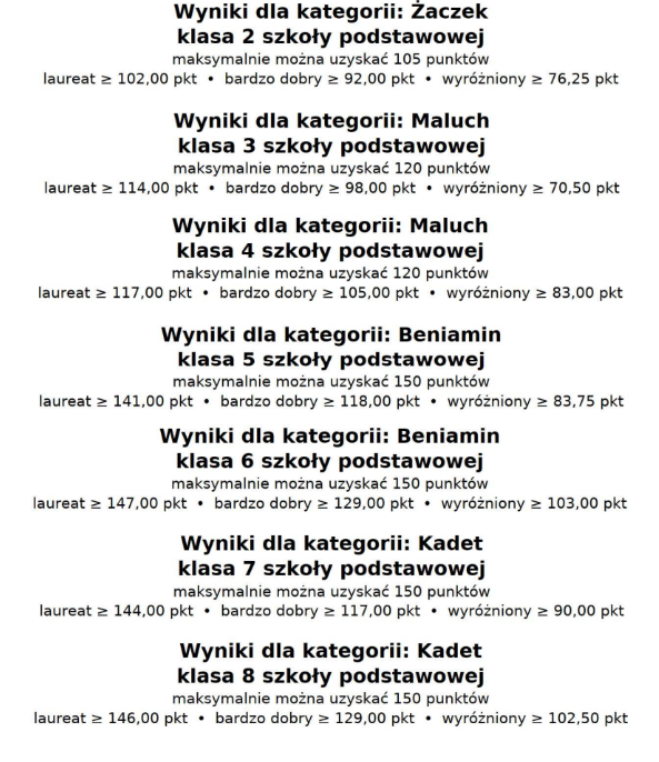 W przypadku chęci uzyskania informacji o wyniku dziecka, które nie znalazło się na liście nagrodzonych, prosimy o kontakt za pośrednictwem e-dziennika – z nauczycielem matematyki (dla klas 4 i wyższych) lub z wychowawcą (w przypadku klas 2–3).